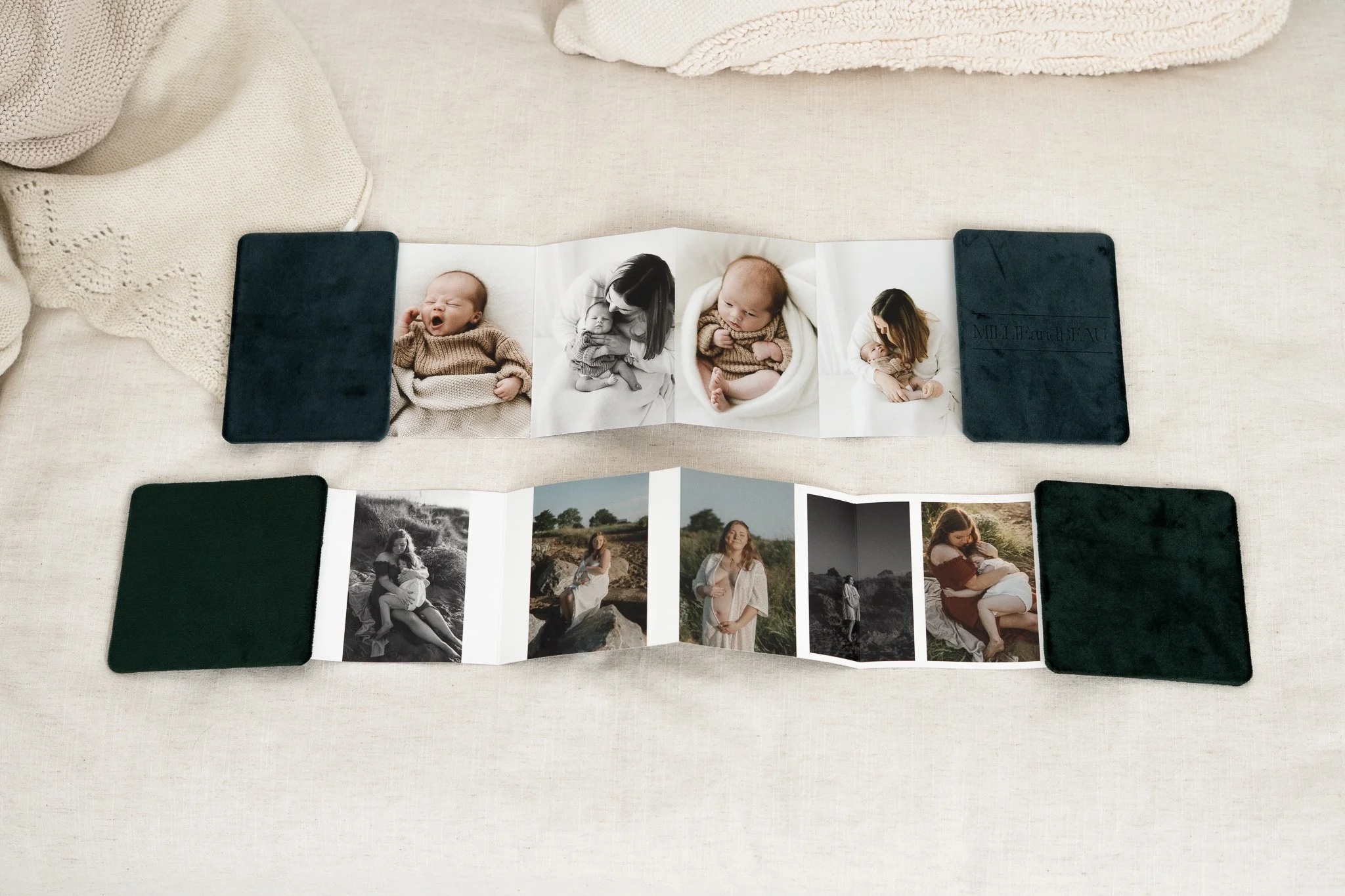A mini accordion book with hidden magnetic closure and gift box with a choice of velvet covers to finish.